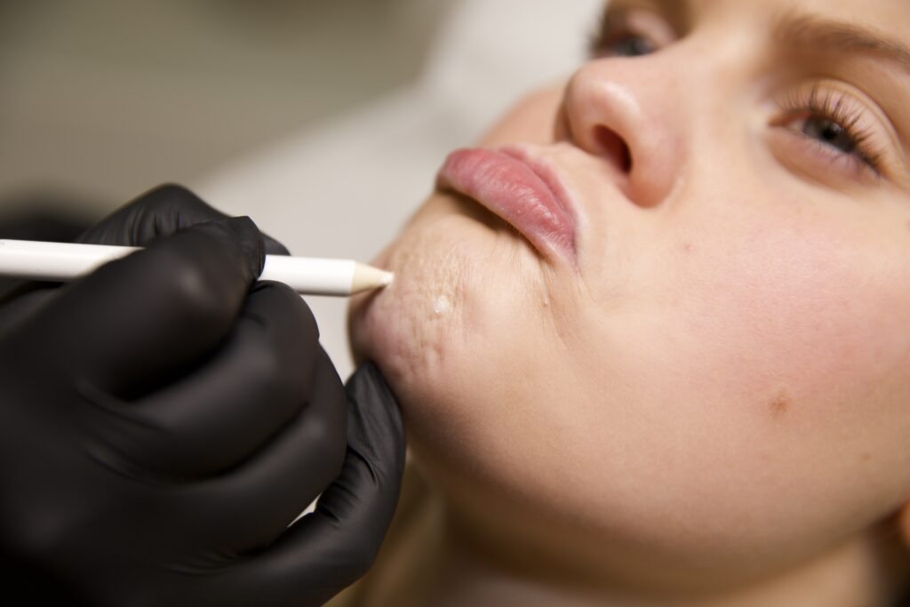 En esteisk injektionsbehandling med muskelavslappnande medel i muskeln på överläppen..